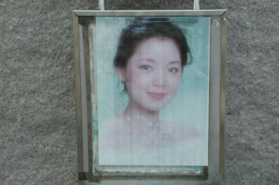 公園內(nèi)還有小憩之地,游人可以在這里邊休息邊聽(tīng)鄧麗君的歌曲。小憩之地在廣場(chǎng)的旁邊,有石桌、石凳,是一個(gè)露天棚的形狀,上面是樹(shù)枝垂伏。這里最引人注意的是,石座中間有一副鄧麗君的照片,是少女時(shí)代的模樣,這樣的安排,仿佛鄧麗君就坐在你身邊,和你坐在一起談心。照片是彩色的,鄧麗君青春煥發(fā),光彩奪人。照片裝在一個(gè)鏡框中,周?chē)悬c(diǎn)發(fā)黑和發(fā)黃,似乎有些陳舊,可能已經(jīng)保存相當(dāng)長(zhǎng)的時(shí)間了。