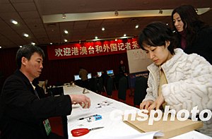 “兩會”新聞中心的工作人員正在為參加“兩會”報道的香港記者辦理采訪證件。估計參加今年全國“兩會”報道的海內外記者將近三千人。作者:盛佳鵬