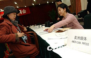 “兩會”新聞中心的工作人員接待的國外記者越來越多,美洲、歐洲、亞洲等多個洲的數(shù)家媒體已到達北京。圖為工作人員在為國外記者辦理“兩會”證件。作者:盛佳鵬