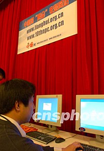 北京一家網(wǎng)絡媒體在“兩會”新聞中心安裝終端展示平臺,供中外記者查詢?yōu)g覽“兩會”信息。作者:張煒