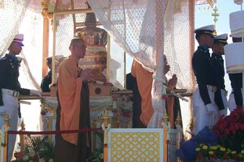 今天早上,泰國曼谷空軍機場舉行了隆重的送歸儀式。泰國文化部長烏萊婉致詞,她以泰國政府、佛教界和全國人民的名義,衷心感謝中國政府為慶祝泰國國王陛下75圣壽大吉,同意佛牙舍利自2002年12月15日至2003年2月28日共76天,赴泰佛統(tǒng)府佛教城臨時供奉76天。她說,供奉期間,泰國人民前往佛教城舉行各種各樣的參拜活動。泰國王儲殿下于1月9日代表國王陛下前往參拜,泰國佛教最高領(lǐng)袖僧王兩次參拜,泰國樞密院主席、國會主席、上議院主席、內(nèi)閣主要領(lǐng)導(dǎo)人以及眾多議員都前往參拜。在佛牙舍利臨時赴泰供奉事宜圓滿成功之際,泰國政府對中國政府和人民以及中國佛教協(xié)會表示衷心的感謝,并祝愿泰中友好萬古長青。