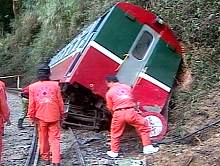 據(jù)島內(nèi)東森新聞報道,編號為110班次的小火車,昨日下午2時許在接近神木站前鐵橋前,突然失控撞山,有2節(jié)車廂懸空掛在鐵橋上,1節(jié)車廂直接摔落五、六公尺深的山谷。