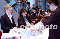 匯豐股控有限公司3月3日公布2002年全年業(yè)績,傳媒爭先在記者會上領取匯豐股控有限公司2002年全年業(yè)績報告,以第一時間發(fā)布新聞。洪少葵 攝
