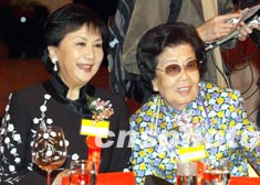 香港電影界著名前輩夏夢(左)三月六日晚盛裝出席此間舉行的慶祝國際婦女節(jié)活動,圖為夏夢與孔愛菊談笑甚歡。潘索菲 攝