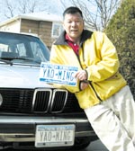 擁有“姚明”車牌的蔣朋。(美國《世界日報》圖)