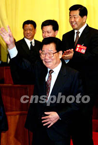 全國政協(xié)十屆一次會議第四次全體會議十三日舉行,會議將選舉出全國政協(xié)新一屆領(lǐng)導(dǎo)人。李瑞環(huán)、賈慶林一同步入會場。作者:鄭萍萍