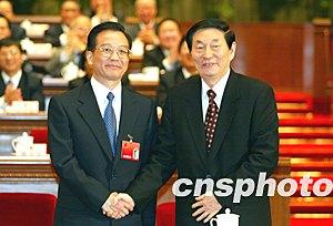中新社北京三月十六日電本社記者張朔在人民大會堂現(xiàn)場報(bào)道:根據(jù)國家主席的提名,今天在這里舉行的十屆全國人大一次會議第六次會議決定,中共中央政治局常委溫家寶為中國新一屆國務(wù)院總理。