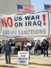 在主戰(zhàn)陣營(yíng)的領(lǐng)導(dǎo)者美國(guó)國(guó)內(nèi),來(lái)自100多個(gè)城市的數(shù)以萬(wàn)計(jì)示威者匯聚到首都華盛頓,以主辦者所形容的“人!睉(zhàn)術(shù),盡最后努力游說(shuō)布什總統(tǒng)聽(tīng)聽(tīng)民間反戰(zhàn)的聲音。示威者在華盛頓紀(jì)念碑集會(huì),其后匯合游行隊(duì)伍,聲勢(shì)浩大地游行往白宮和司法部。一名大學(xué)生呼吁:“布什總統(tǒng),聽(tīng)聽(tīng)今天在你面前人民的聲音吧,美國(guó)人說(shuō)“不要向伊拉克開(kāi)戰(zhàn)””。