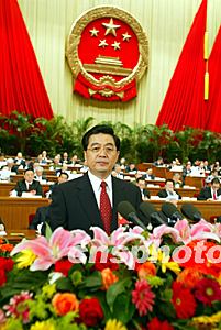 胡錦濤說,新一屆國家機(jī)構(gòu)工作人員是在國際形勢復(fù)雜多變、國內(nèi)建設(shè)任務(wù)艱巨繁重的新形勢下?lián)?fù)重任的,為了履行好人民賦予的神圣職責(zé),我們一定努力做到:
