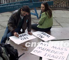三月十七日在聯(lián)合國(guó)安理會(huì)為避免戰(zhàn)爭(zhēng)竭盡所能之時(shí),守候在聯(lián)合國(guó)大樓外的反戰(zhàn)者書寫反戰(zhàn)標(biāo)語,為阻止戰(zhàn)爭(zhēng)做最后努力。作者:趙海燕