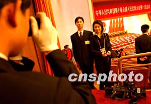在三月北京舉行的十屆全國人大一次會議閉幕前,工作人員與CCTV主持人王小丫合影留念。作者:賈國榮