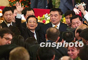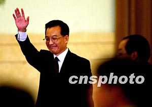 新任國務(wù)院總理溫家寶三月十八日舉行新聞發(fā)布會后,向記者們揮手致意。作者:張煒