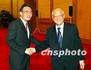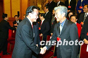 吳邦國(guó)委員長(zhǎng)十八日下午在北京人民大會(huì)堂會(huì)見(jiàn)出席十屆人大一次會(huì)議的港澳代表。圖為吳邦國(guó)與香港代表吳康民握手。作者:毛建軍