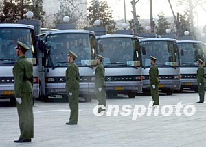 解放軍官兵在北京的京西賓館護(hù)送全國人大代表們各奔前程,將中國新一屆政府的改革決策傳遍大江南北。作者:賈國榮