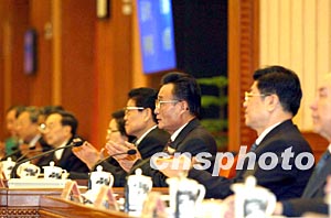 十屆全國(guó)人大常委會(huì)一次會(huì)議十九日在北京舉行,全國(guó)人大常委會(huì)委員長(zhǎng)吳邦國(guó)及新當(dāng)選的副委員長(zhǎng)們出席。作者:滿(mǎn)會(huì)喬