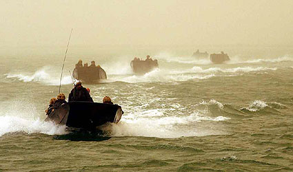 英國海軍陸戰(zhàn)隊突擊兵和美國海軍陸戰(zhàn)隊員們想重演二戰(zhàn)時西西里島登陸戰(zhàn)的場面,可伊拉克軍隊卻不配合:當(dāng)?shù)貢r間20日晚,科威特北部的美英重炮部隊、阿拉伯灣北部水域的海軍艦炮、巡航導(dǎo)彈和美國航母起飛的艦載機同時對伊拉克第二大城市巴士拉的戰(zhàn)略門戶――法奧半島進行了煞有介事的狂轟濫炸。