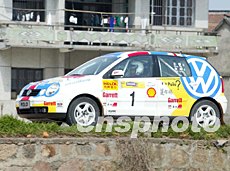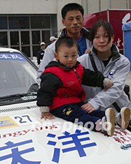 北京慶洋拉力車隊(duì)車手陳德安駕駛捷達(dá)GTX賽車,參加2003年中國汽車?yán)惿虾U颈荣。?2日發(fā)車儀式前,特意從北京趕來的妻子與兩歲的兒子前來助陣,期望取得好成績。作者:趙振清