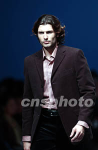 三月二十六日,“杉杉”秋冬男裝發(fā)布會在北京舉行,整體的服裝風格以簡約、舒適為主流。圖為模特展示一款時尚男裝。作者:盛佳鵬