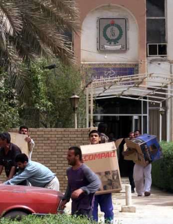 路透社記者看到伊拉克人群首先洗劫了設(shè)在巴格達(dá)運(yùn)河賓館的聯(lián)合國駐伊拉克辦事機(jī)構(gòu)。另有一名目擊者稱,伊拉克劫掠者還在遭到美軍轟炸的伊拉克奧林匹克委員會(huì)大樓附近大肆搶掠各家體育用品商店里的貨物。