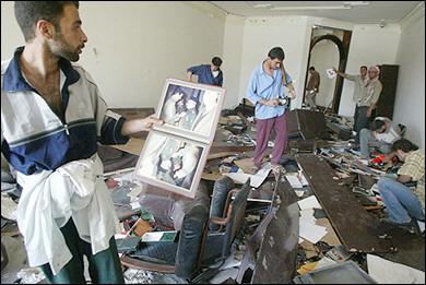 薩達(dá)姆的宮殿被腳手架包圍,毫無(wú)疑問(wèn)在兩周之前,被一枚2000磅的炸彈擊中之前仍然還在建設(shè)之中。散落一地的是那些羅馬風(fēng)格的裸體雕塑,陶瓷獅子雕塑等等。