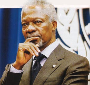 “從遠(yuǎn)處來看,灰白色的頭發(fā)與胡須使得安南的臉上仿佛籠罩著一層淡淡的光環(huán)!睒O富散文情調(diào)的《紐約客》雜志這樣描寫安南的臉龐。然而,近距離看過安南的人都會同意,實(shí)際上那是一張最為普通不過的臉。在任何時(shí)候,它都不會讓你感覺到它隱藏了什么,當(dāng)然你也不會從中看出什么。對于聯(lián)合國秘書長來說,擁有這樣一張臉龐恐怕最為合適不過。因?yàn)樵谶@個(gè)充滿矛盾的國際舞臺上,聽取別人而隱藏自己的意見是聯(lián)合國秘書長這個(gè)職位必備的素質(zhì)。