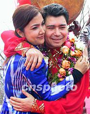 “二OO三阿迪力極限之旅”四月十六日在北京幕田峪長(zhǎng)城舉行啟程儀式!案呖胀踝印卑⒌狭⑦M(jìn)行極限表演。圖為阿迪力在臨行前與妻子相擁。作者:盛佳鵬