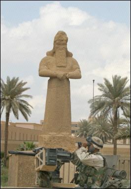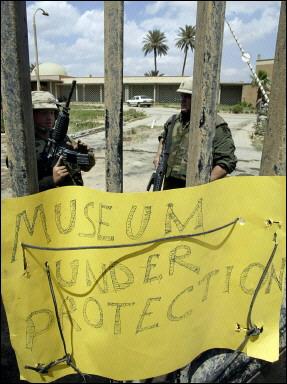 美英聯(lián)軍攻入伊拉克首都巴格達后,陷入嚴重混亂之中。伊拉克國家博物館遭到大肆洗劫,大量幾千年前的珍貴文物遭到破壞和掠奪。圖為美國海軍陸戰(zhàn)隊士兵在伊拉克國家博特館守衛(wèi)。