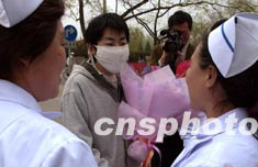 中新社北京四月十七日電(記者曾利明)北京佑安醫(yī)院今天舉行了一個(gè)特別的歡送會(huì),歡送又一位痊愈的非典型肺炎患者出院。醫(yī)院的院長(zhǎng)、書記、參加治療的醫(yī)生和護(hù)士代表一起把患者送出病區(qū)。站在醫(yī)院大門口的康復(fù)患者小石是為個(gè)二十歲的大學(xué)生。滿臉喜色的他,一邊接受兩位護(hù)士獻(xiàn)上的鮮花,一邊點(diǎn)頭向半個(gè)多月來為他精心治療、護(hù)理的大夫護(hù)士致謝:“謝謝你們!謝謝佑安醫(yī)院!”