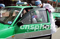 甘肅蘭州市疾病預(yù)防控制中心,近日對該市所有的士進(jìn)行消毒,以預(yù)防“非典型肺炎”的發(fā)生。作者:劉呈軍