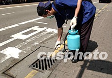 在香港“復(fù)活節(jié)”假期,全民總動員清潔香港預(yù)防病毒蔓延,21日衛(wèi)生部門派出人員消毒馬路污水渠道。洪少葵 攝