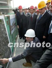 國務(wù)院總理溫家寶二十五日陪同法國總理拉法蘭參館國家大劇院工地時(shí),聽取設(shè)計(jì)師介紹情況。作者:滿會(huì)喬