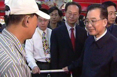 溫家寶二十六日與副總理吳儀一起在北京市建筑工地、超市、社區(qū)、高校考察。