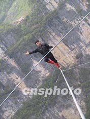 “高空王”阿迪力二十八日在重慶奉節(jié)小寨天坑成功試走橫跨天坑、總長(zhǎng)800米的鋼絲。五月三日阿迪力將在這段鋼絲上進(jìn)行達(dá)瓦孜絕技的表演,挑戰(zhàn)高空鋼絲行走極限。作者:盛佳鵬