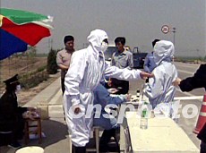 中國交通部五月再令各地迅速采取措施,嚴防“非典”向農(nóng)村擴散。圖為交通部門在路口設(shè)立衛(wèi)生檢查站,對車輛人員進行檢查消毒。作者:中新社