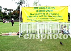 香港市民在“非典型肺炎”疫情放緩之際,暫且放下口罩走出戶外在公園草坪享受清新空氣.而宣傳檢控亂拋垃圾的廣告?zhèn)涫茏⒛俊:樯倏?攝