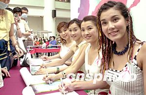 “2003年度香港小姐競選”5月10日在香港奧海城商場舉行簽名活動。應(yīng)屆港姐冠軍林敏俐(右二)、亞軍左慧琪(右一)、季軍胡家惠(左一)等出席簽名宣傳活動。鄧慶樂 攝