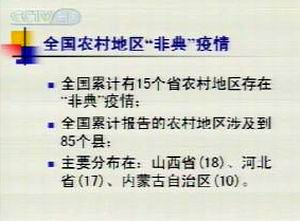 但是在這個(gè)關(guān)鍵時(shí)刻,我們絕對(duì)不能放松警惕,不能麻痹大意,我們要防治病情的反彈。特別是是我們要注意到疫情在新的情況底下蔓延,所以我要講一下第二個(gè)問題,我們要禁止疫情向農(nóng)村擴(kuò)散,我們現(xiàn)在先看這個(gè)數(shù)字,現(xiàn)在全國已經(jīng)有15個(gè)省,農(nóng)村地區(qū)存在了非典疫情,已經(jīng)有85個(gè)縣分布在山西省河北省和內(nèi)蒙古自治區(qū)。這個(gè)比例比較高。另外,確診病例中,農(nóng)民占的比例雖然不高,只有6%左右,但是我們看到從5月1號(hào)開始,這個(gè)比例是持續(xù)上升的,到5月11號(hào)已經(jīng)達(dá)到了6.2%,從這個(gè)數(shù)字我們可以看到,在農(nóng)民和農(nóng)村的疫情雖然比較輕,但是有上升的趨勢(shì),我們一定要密切注意這個(gè)疫情向農(nóng)村蔓延的趨勢(shì)。