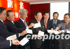 為表彰香港前線抗炎醫(yī)護(hù)人員,香港六百多個(gè)民間團(tuán)體首次大聯(lián)盟,五月十三日在香港共同發(fā)起“香港是我家──支持前線醫(yī)護(hù)人員籌款活動(dòng)”。圖為香港民政事務(wù)局局長(zhǎng)何志平出席捐款儀式,對(duì)捐款者表示感謝。中新社傳真 錢興強(qiáng) 攝