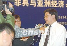博鰲亞洲論壇《SARS與亞洲經(jīng)濟的影響評估與政策建議研討會》五月十三日開始在北京舉行,圖為出席會議的亞洲開發(fā)銀行北京辦事處首席經(jīng)濟學(xué)家湯敏接受記者訪問。