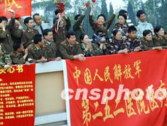 昨天中午我還在熟睡中就聽見戰(zhàn)友們歡呼著奔走呼應(yīng)“走嘍!看節(jié)目去!”也真是的,來小湯山半個多月了,不但沒出去過也沒見過外面的人,真是憋壞了!這樣的熱鬧當(dāng)然少不了我,我一骨碌爬起來沖了出去。天氣可真涼,剛出門口就連打了三個噴涕。十五點十分,演出還沒有開始,演員們已經(jīng)在化妝準(zhǔn)備了。一個排的武警官兵齊刷刷地坐在小板凳上板挺板挺的,嗨!比我還積極!十五點四十分演員們還在緊張地準(zhǔn)備,我卻已經(jīng)站不住了,天公實在不作美,不但刮著寒風(fēng)還夾雜著星星雨點,我裹了件迷彩服還忍不住打哆嗦?稍倏纯囱輪T們穿的比我還少,卻在熱火朝天地忙乎著,嘻,真是不好意思!
