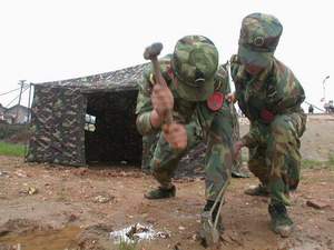 在昨日的演練中,官兵們集中演習了野外照明修理所、夜間照明、防洪子堤構筑、植樁機植樁以及水上探險等5大軍事課目。記者在現(xiàn)場看到,這5大項目緊密相連,整個過程的完成沒有超過30分鐘,卻形成了一套非常穩(wěn)固的防洪搶險“屏障”。此外,該團官兵還實地演練了水上救險、水上打撈以及裝卸載等課目。在50米范圍的水域內,如發(fā)現(xiàn)有人落水,沖鋒舟進行成功救助,只需短短幾分鐘時間。