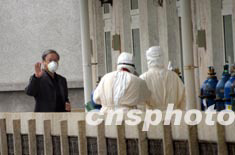 “非典”感染者、中國著名導(dǎo)演謝飛在接受二十四天的治療后痊愈,五月十六日在地壇醫(yī)出院前和醫(yī)生揮手告別。中新社記者:盛佳鵬
