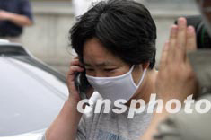 “非典”感染者、中國著名導(dǎo)演謝飛經(jīng)過二十四天的治療五月十六日治愈出院,謝飛夫人崔女士在地壇醫(yī)院外等候時打電話問候即將出院的謝飛。中新社記者:盛佳鵬