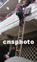 雙清區(qū)環(huán)衛(wèi)局領(lǐng)導(dǎo)用梯子將困在二樓的群眾接上船