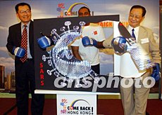 香港推出“吃喝玩樂Come Back Hong Kong”運動。“吃喝玩樂Come Back Hong Kong”運動五月十九日在香港展開,其旨在鼓勵香港市民拋開對非典型肺炎疫情的憂慮,重新投入積極的生活。圖為香港總商會總裁翁以登(左)、香港餐飲聯(lián)業(yè)協(xié)會會長伍德良(右)等擊打“SARS病毒”從而為該活動揭幕。中新社記者:潘索菲
