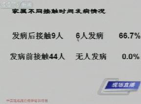 下面介紹的就是該病人非典病毒傳播的傳播鏈。該病人在其家屬中的傳播率為66.7%(2/3)。同時,除造成家屬傳播外,又造成醫(yī)院同房病友及相關(guān)醫(yī)護人員的傳播?偣苍斐18個非典病例。其中密切接觸者共有6人發(fā)病,并且發(fā)病者有和該病人發(fā)病期接觸史。