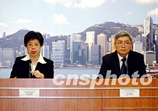 香港衛(wèi)生署長陳馮富珍及醫(yī)院管理局行政經(jīng)理劉少懷,5月22日在記者會(huì)公布新增3宗SARS個(gè)案,當(dāng)中沒有醫(yī)護(hù)人員,再有3名女病人死亡。另外有10名康復(fù)者出院,香港至今已連續(xù)7天錄得少于5個(gè)SARS感染病例。洪少葵 攝