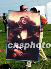 一名北京藝術(shù)家捧出戴防毒面具的《蒙娜麗莎》油像新作,參加京郊五月下旬抗擊“非典”為主題的“藍(lán)天不設(shè)防”藝術(shù)行動。中新社記者:鄒憲