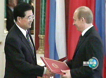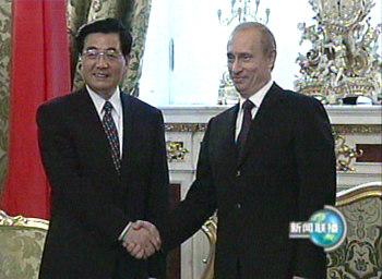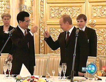 今天是胡錦濤主席訪俄的第二天。當(dāng)?shù)貢r(shí)間今天上午,胡錦濤主席向無名烈士墓敬獻(xiàn)了花圈,并參觀了俯首山衛(wèi)國戰(zhàn)爭博物館。中午,普京總統(tǒng)在克里姆林宮為胡錦濤主席舉行了歡迎儀式并進(jìn)行小、大范圍會談。會談結(jié)束后,兩國元首簽署了中俄聯(lián)合聲明等三個文件。