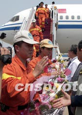 中國(guó)地震局局長(zhǎng)宋瑞祥,外交部、商務(wù)部、國(guó)土資源部、民航總局、解放軍總參謀部、武警總隊(duì)等單位負(fù)責(zé)人以及阿爾及利亞駐華大使到機(jī)場(chǎng)迎接凱旋的中國(guó)國(guó)際救援隊(duì)一行。